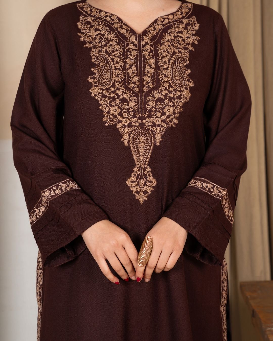The premium Alpine Karandi fabric gives a luxurious drape, soft texture, and season-friendly comfort, making it a versatile choice for winter gatherings, family events, and festive evenings.