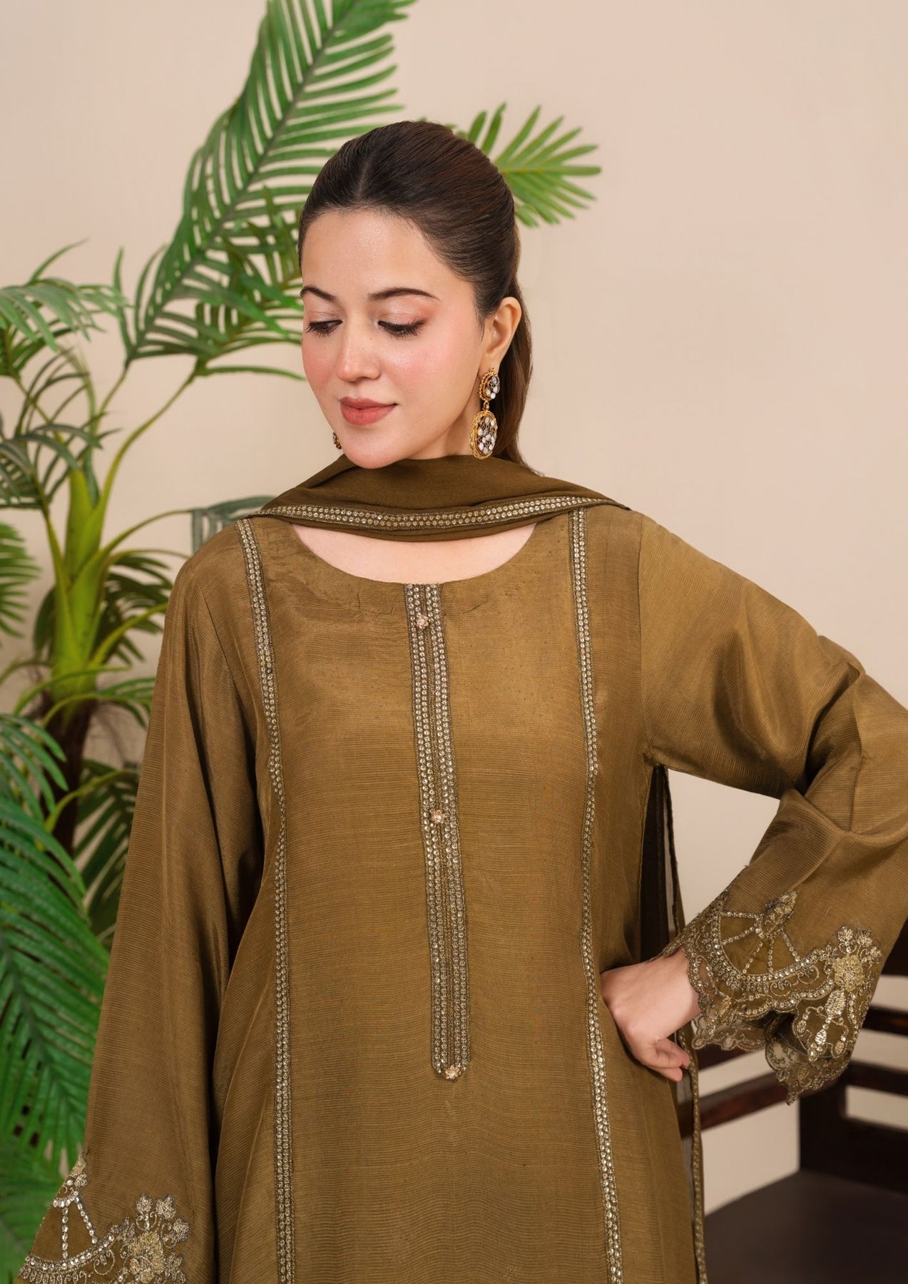 Crafted in a rich olive-brown tone, this elegant 3-piece ensemble is made from premium silk viscose, offering a soft texture with a graceful, fluid drape. The straight-cut shirt features refined embellishment detailing along the neckline and vertical panels, complemented by delicate embroidery on the sleeves and hem for a subtle yet luxurious finish.