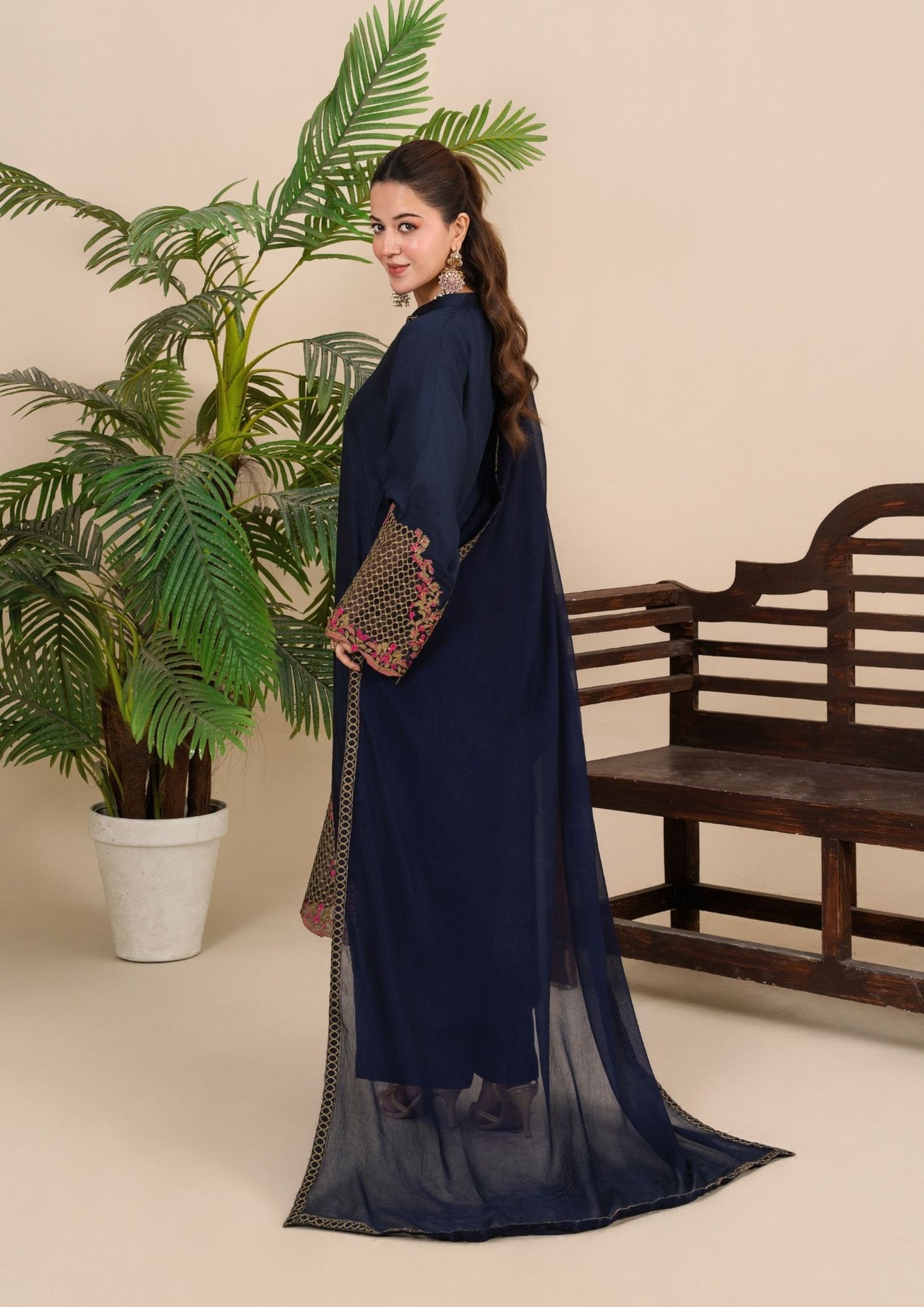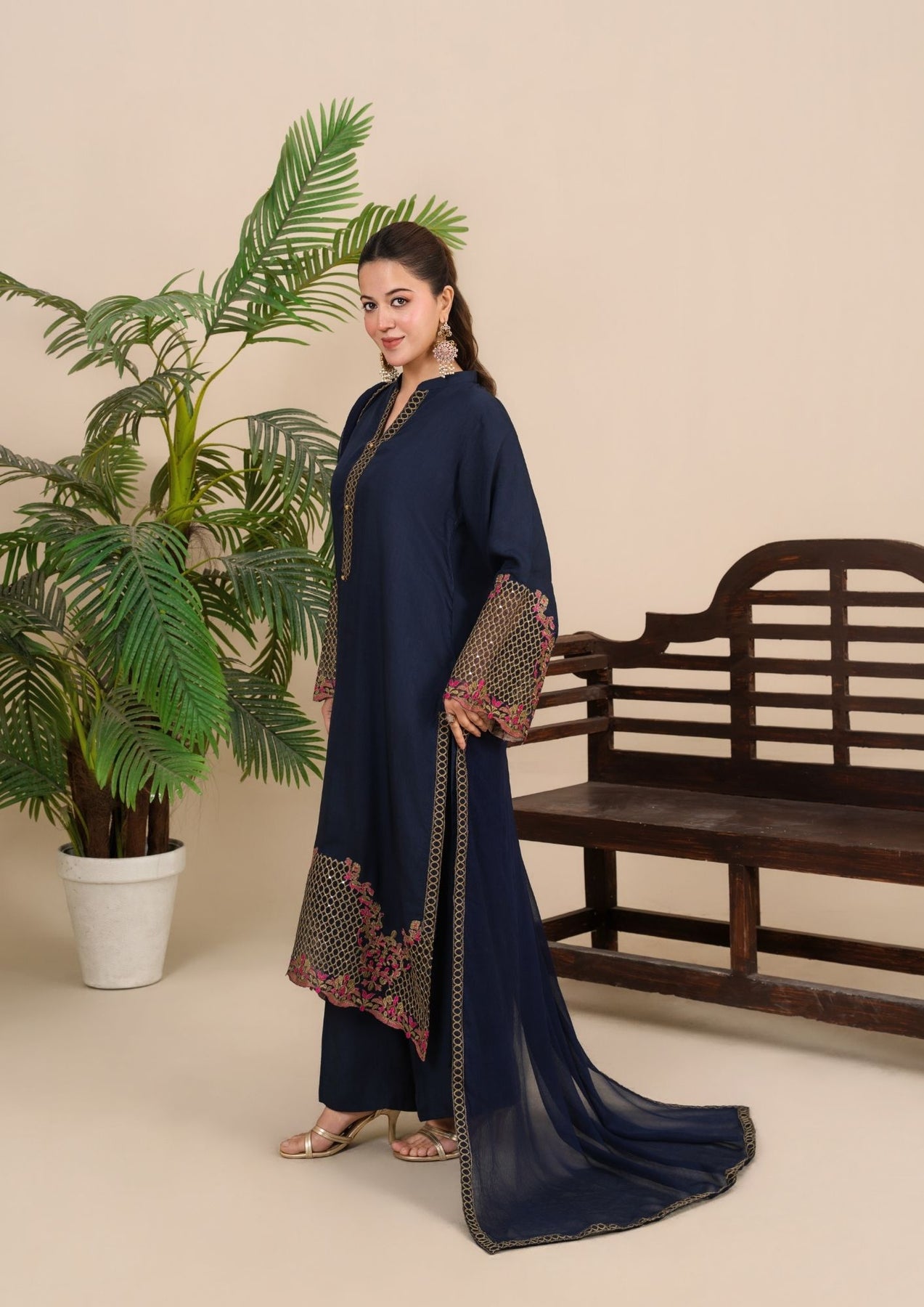 Crafted in a rich navy blue hue, this sophisticated 3-piece ensemble is made from premium silk viscose, offering a smooth texture with a graceful, fluid fall. The straight-cut shirt is enhanced with intricate embroidery along the neckline, sleeves, and hem, featuring delicate floral accents that add depth and refined elegance.