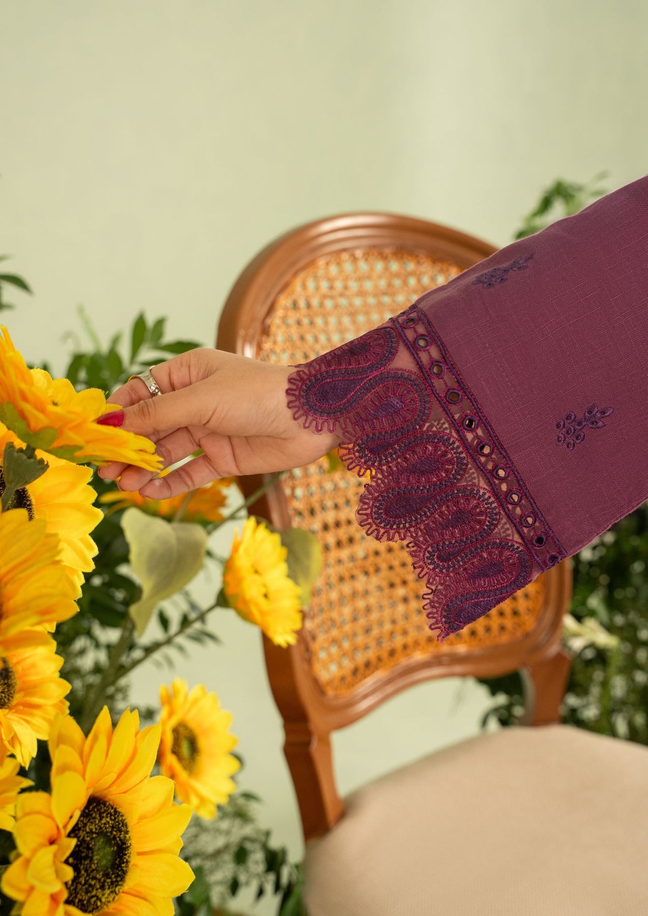 Embroidered sleeves with cutwork and paisley-inspired lace finish