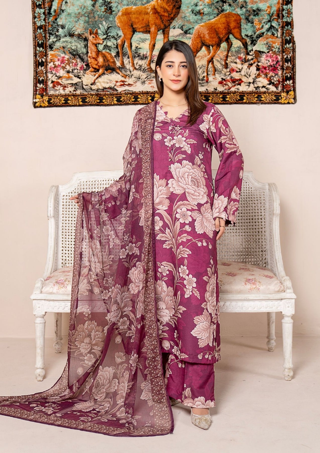 • Bottom: The outfit is paired with comfortable straight-cut trousers, also made from digital printed Arabic Silk lawn, showcasing the same exuberant floral print for a perfectly coordinated and lively look.